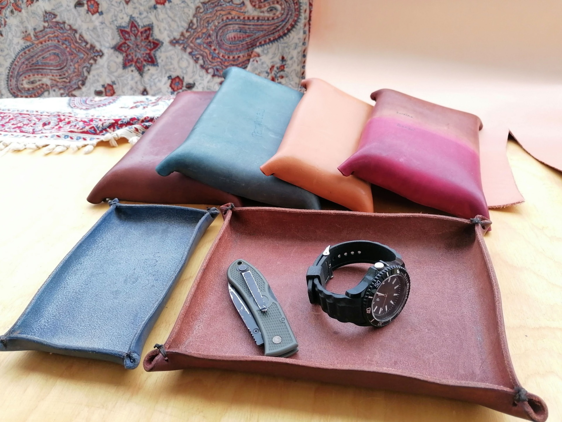 Nadčasový geometrický design. Miska má tu praktickou vlastnost, že se hodí vždycky a všude. Odkládá se do ní mobil, klíče, nebo vlastně cokoliv :). Výroba je jednoduchá a je to skutečný relax, vlastně si většinu času hrajete s povrchem, řežete, opracováváte hrany, barvíte a na závěr nanášíte vosk a leštíte. Miska je prošitá v rozích různým druhem barevných nití, spoj je nezničitelný. Miska se hodí jednoduchostí i pro práci s dětmi, zvládne ji skutečně každý. Tento ateliér umím udělat i "průtokový", takže kdo přijde vyrobí si misku a pokračuje dál, například na firemní rodinné dny.
